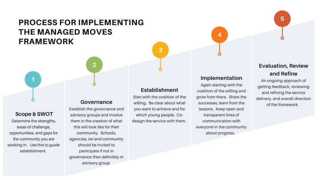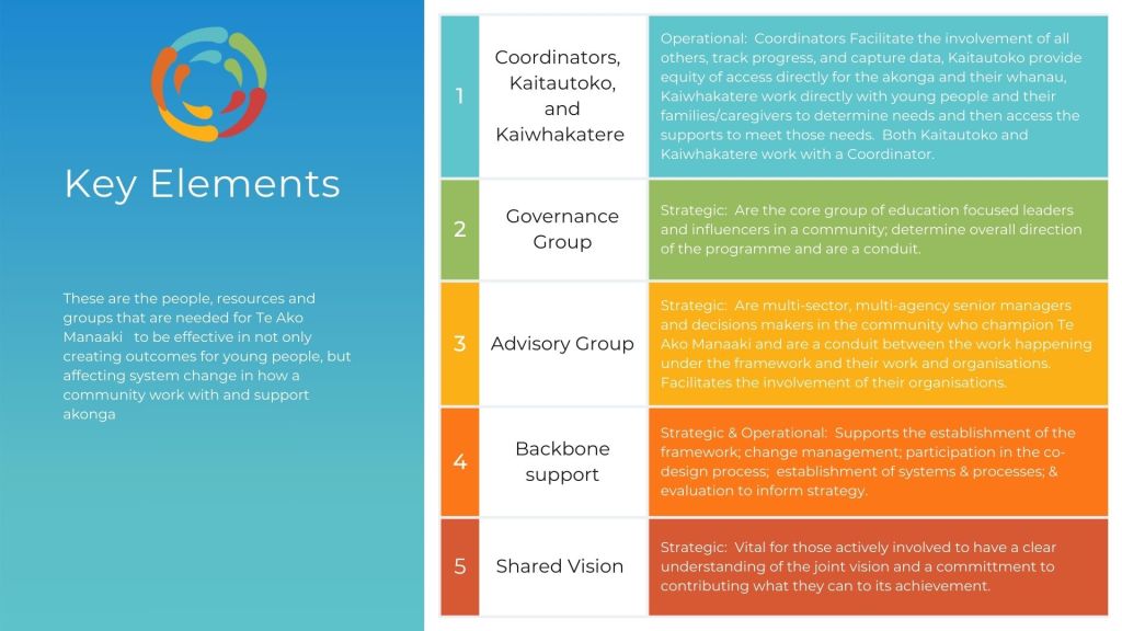 The Te Ako Manaaki Framework has 5 core elements, which use 5 core principles to create a collaborate practice that improves outcomes for young people. Below is a visual summary of these, along with a high level five step process for establishing the framework.